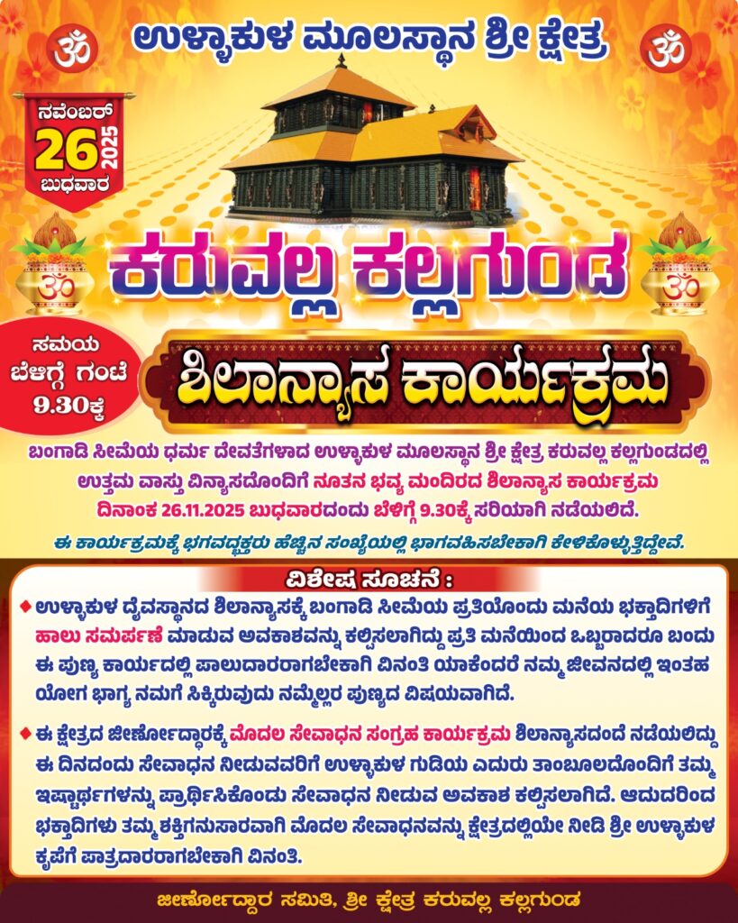 ಬಂಗಾಡಿ: ಬಂಗಾಡಿ ಸೀಮೆಯ ಧರ್ಮ ದೇವತೆಗಳಾದ ಉಳ್ಳಾಕುಳ ಮೂಲಸ್ಥಾನ ಶ್ರೀ ಕ್ಷೇತ್ರ ಕರುವಲ್ಲ ಕಲ್ಲಗುಂಡದಲ್ಲಿ ಉತ್ತಮ ವಾಸ್ತು ವಿನ್ಯಾಸದೊಂದಿಗೆ ನೂತನ ಭವ್ಯ ಮಂದಿರದ ಶಿಲಾನ್ಯಾಸ ಕಾರ್ಯಕ್ರಮ ದಿನಾಂಕ 26.11.2025 ಬುಧವಾರದಂದು ಬೆಳಿಗ್ಗೆ 9.30ಕ್ಕೆ ಸರಿಯಾಗಿ ನಡೆಯಲಿದೆ.