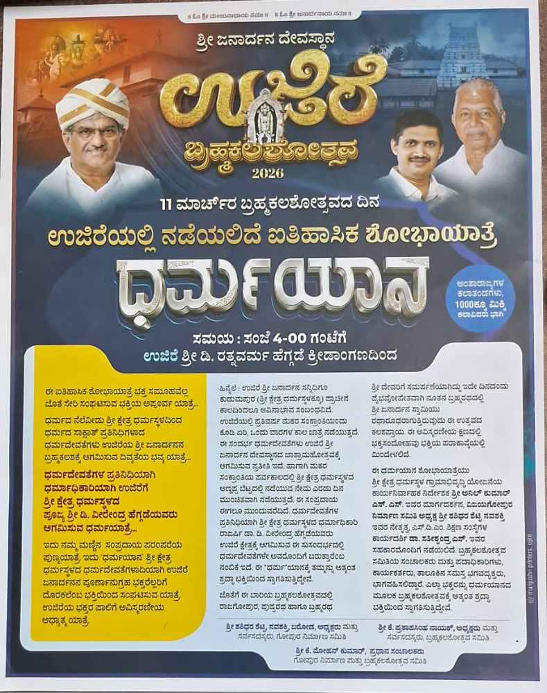 ಉಜಿರೆಯಲ್ಲಿ ನಡೆಯಲಿದೆ ಭವ್ಯ ಶೋಭಾಯಾತ್ರೆ ‘ಧರ್ಮಯಾನ’ – ಮಾರ್ಚ್ 11 ರಂದು ಸಾವಿರಾರು ಭಕ್ತರ ಭಾಗವಹಿಸುವಿಕೆ ನಿರೀಕ್ಷೆ