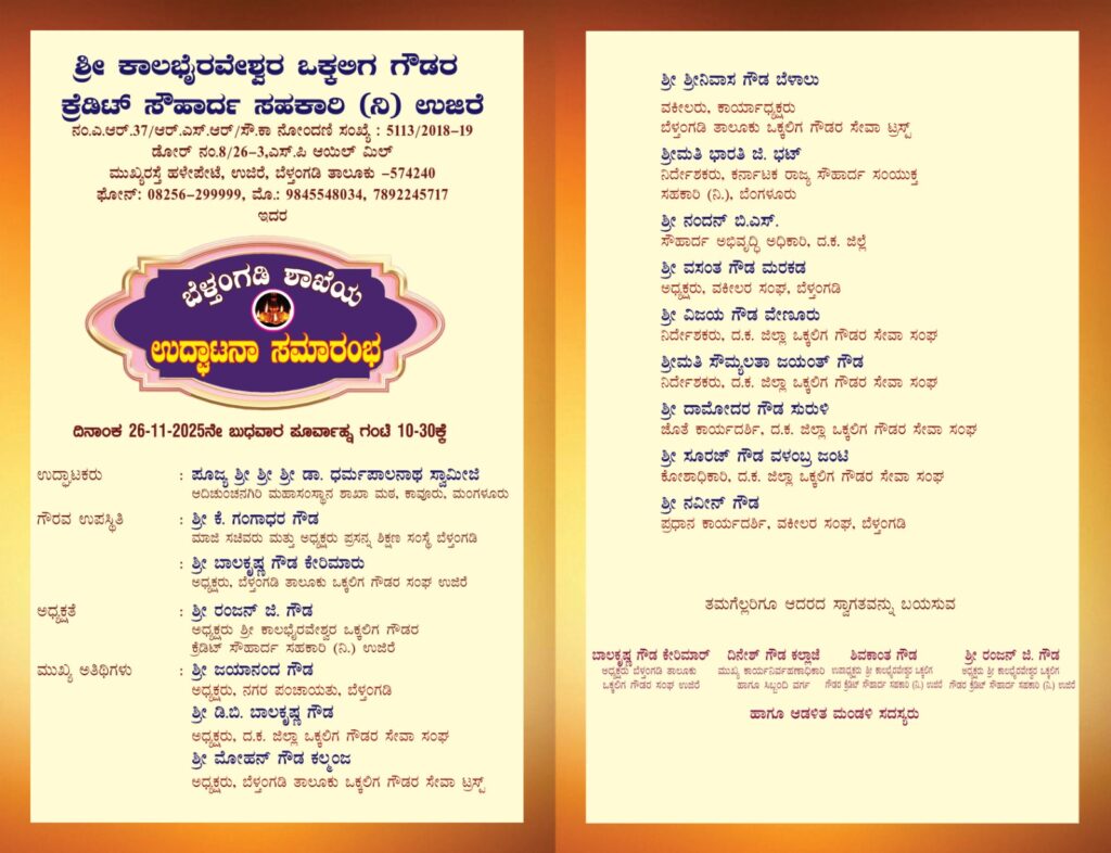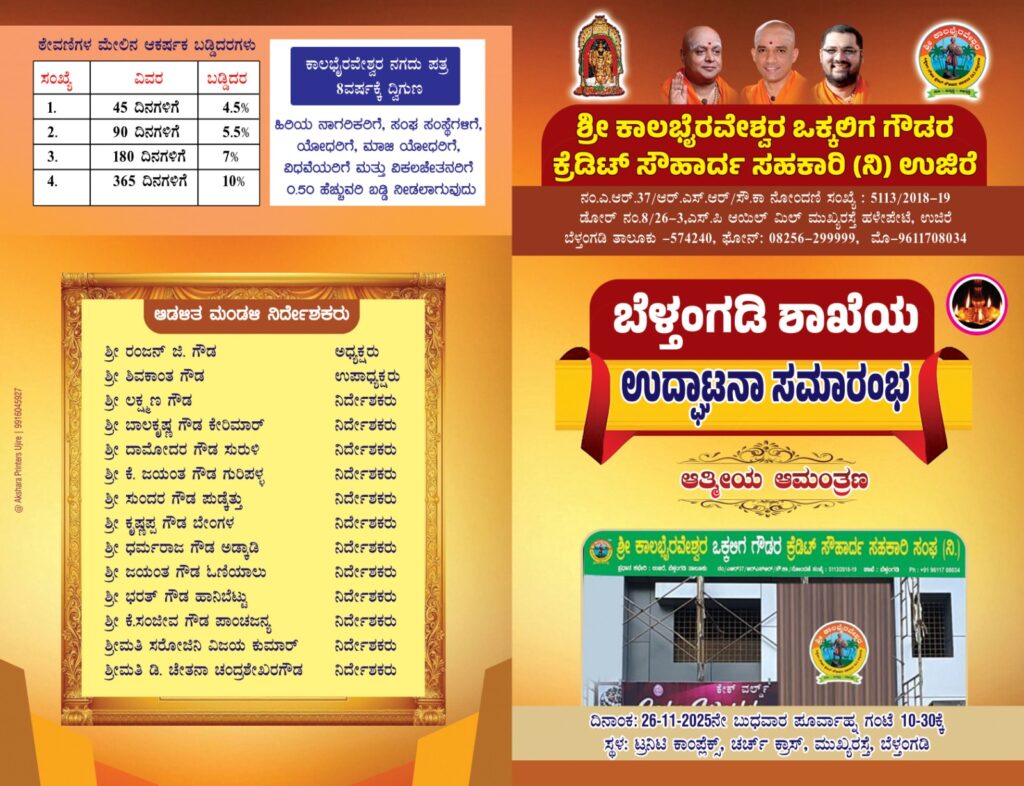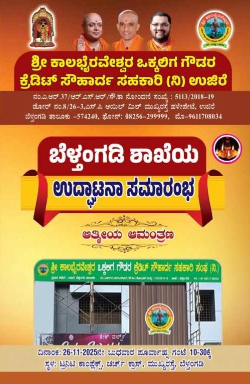 ಬೆಳ್ತಂಗಡಿ: ಶ್ರೀ ಕಾಲಭೈರವೇಶ್ವರ ಒಕ್ಕಲಿಗ ಗೌಡರ ಕ್ರೆಡಿಟ್ ಸೌಹಾರ್ದ ಸಹಕಾರಿ (ನಿ) ಉಜಿರೆ ಇದರ ಬೆಳ್ತಂಗಡಿ ಶಾಖೆಯ ಉದ್ಘಾಟನಾ ಸಮಾರಂಭ ಇಂದು ಟ್ರಿನಿಟಿ ಕಾಂಪ್ಲೆಕ್ಸ್ ಚರ್ಚ್ ರೋಡ್ ಬೆಳ್ತಂಗಡಿಯಲ್ಲಿ ಬೆಳಿಗ್ಗೆ 10.30ಕ್ಕೆ ಸರಿಯಾಗಿ ನಡೆಯಲಿದೆ.