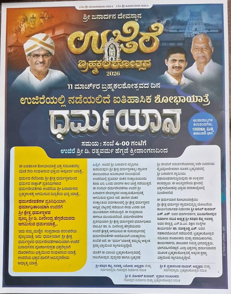 ಉಜಿರೆ: ಶ್ರೀ ಜನಾರ್ಧನ ದೇವರ ಸನ್ನಿಧಾನದಲ್ಲಿ ನಡೆಯುತ್ತಿರುವ ಬ್ರಹ್ಮಕಲಶೋತ್ಸವದ ಸಂದರ್ಭದಲ್ಲಿ ವಿಶೇಷ ಧಾರ್ಮಿಕ ಶೋಭಾಯಾತ್ರೆ ‘ಧರ್ಮಯಾನ’ ಎಂಬ ಭವ್ಯ ಕಾರ್ಯಕ್ರಮವನ್ನು ಆಯೋಜಿಸಲಾಗಿದೆ.