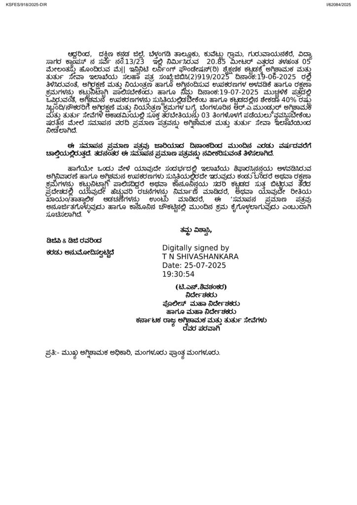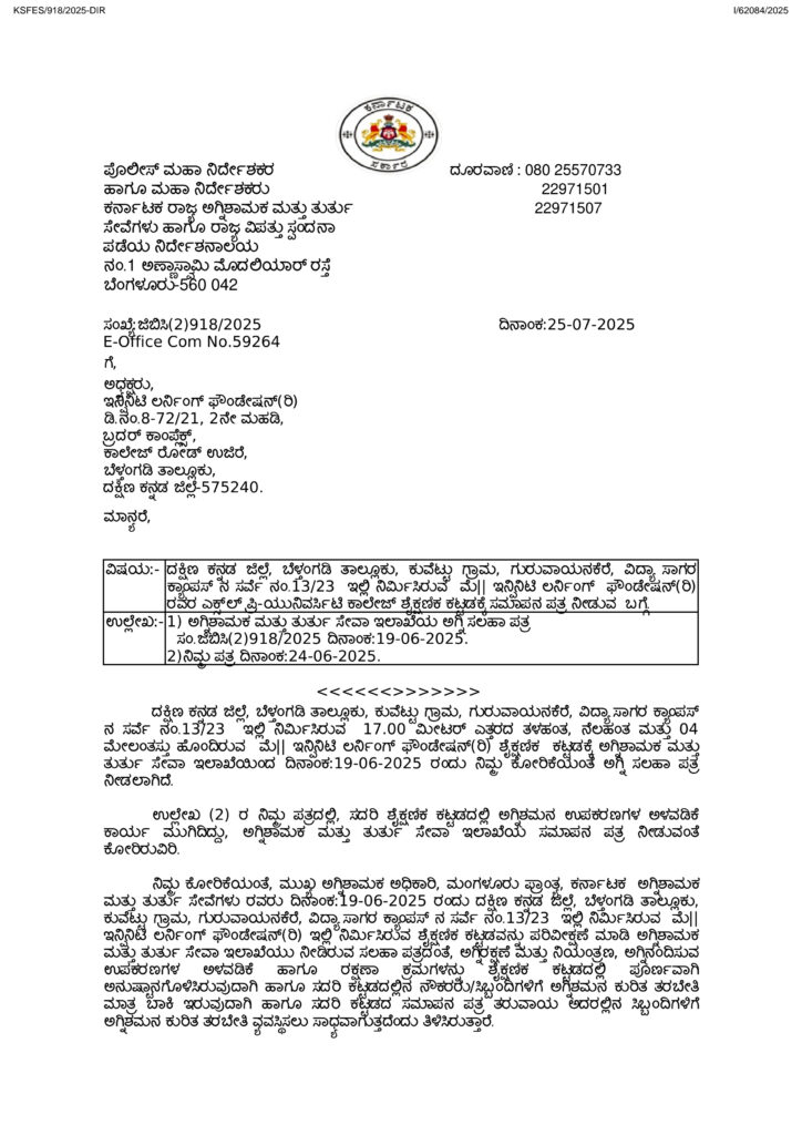 ಅಗ್ನಿ ಶಾಮಕ ಹಾಗೂ ತುರ್ತು ಸೇವಾ ಇಲಾಖೆಯ ನಿಯಮಾನುಸಾರ ಅಗ್ನಿ ಸುರಕ್ಷತೆಯ ಎಲ್ಲಾ ಅಗತ್ಯ ಉಪಕರಣಗಳನ್ನು ಅಳವಡಿಸಲಾಗಿದ್ದು, ಅಧಿಕಾರಿಗಳ ಪರಿಶೀಲನೆಯ ಬಳಿಕ 25-07-2025 ರಂದು ಸಮಾಪನ ಪತ್ರ (ಸಂ. ಜಿಬಿಸಿ.(2)918/2025, E-Office Com No.59264) ನೀಡಲಾಗಿದೆ ಎಂದು ಆಡಳಿತ ಮಂಡಳಿ ಮಾಹಿತಿ ನೀಡಿದೆ.