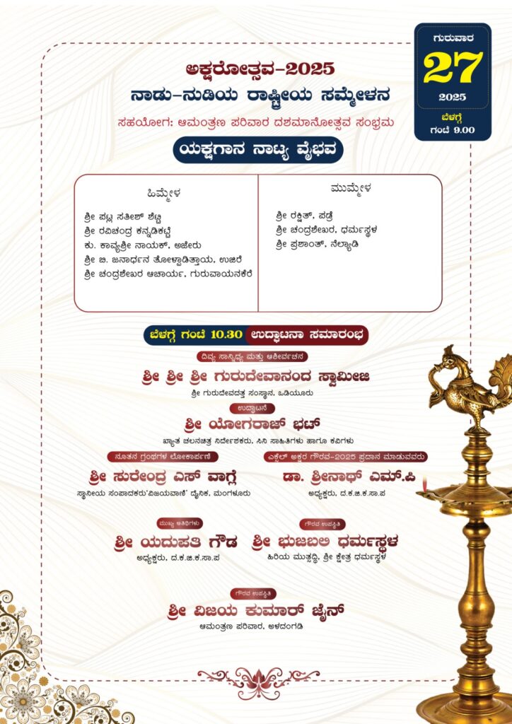 ನ.27ರಂದು ಬೆಳಗ್ಗೆ 9ಕ್ಕೆ ಆಮಂತ್ರಣ ಪರಿವಾರದ ದಶಮಾನೋತ್ಸವ ಸಂಭ್ರಮದ ಸಹಯೋಗದಲ್ಲಿ ಯಕ್ಷಗಾನ ನಾಟ್ಯ ವೈಭವ ನಡೆಯಲಿದೆ. 10.30ಕ್ಕೆ ಒಡಿಯೂರು ಶ್ರೀ ಗುರುದೇವಾನಂದ ಸ್ವಾಮೀಜಿ ಆಶೀರ್ವಚನ ನೀಡಲಿದ್ದು, ಸಿನಿ ಸಾಹಿತಿ ಹಾಗೂ ಚಲನಚಿತ್ರ ನಿರ್ದೇಶಕ ಯೋಗರಾಜ್ ಭಟ್ ಉದ್ಘಾಟಿಸಲಿದ್ದಾರೆ. ಪತ್ರಕರ್ತ ಸುರೇಂದ್ರ ಎಸ್.ವಾಗ್ಲೆ ನೂತನ ಗ್ರಂಥಗಳ ಲೋಕಾರ್ಪಣೆ ಮಾಡಲಿದ್ದು, ದ.ಕ.ಜಿಲ್ಲಾ ಕನ್ನಡ ಸಾಹಿತ್ಯ ಪರಿಷತ್ ಅಧ್ಯಕ್ಷ ಡಾ | ಶ್ರೀನಾಥ್‌ ಎಂ.ಪಿ. ಯವರು ಎಕ್ಸೆಲ್ ಅಕ್ಷರ ಗೌರವ-2025 ಪ್ರದಾನ ಮಾಡಲಿದ್ದಾರೆ.