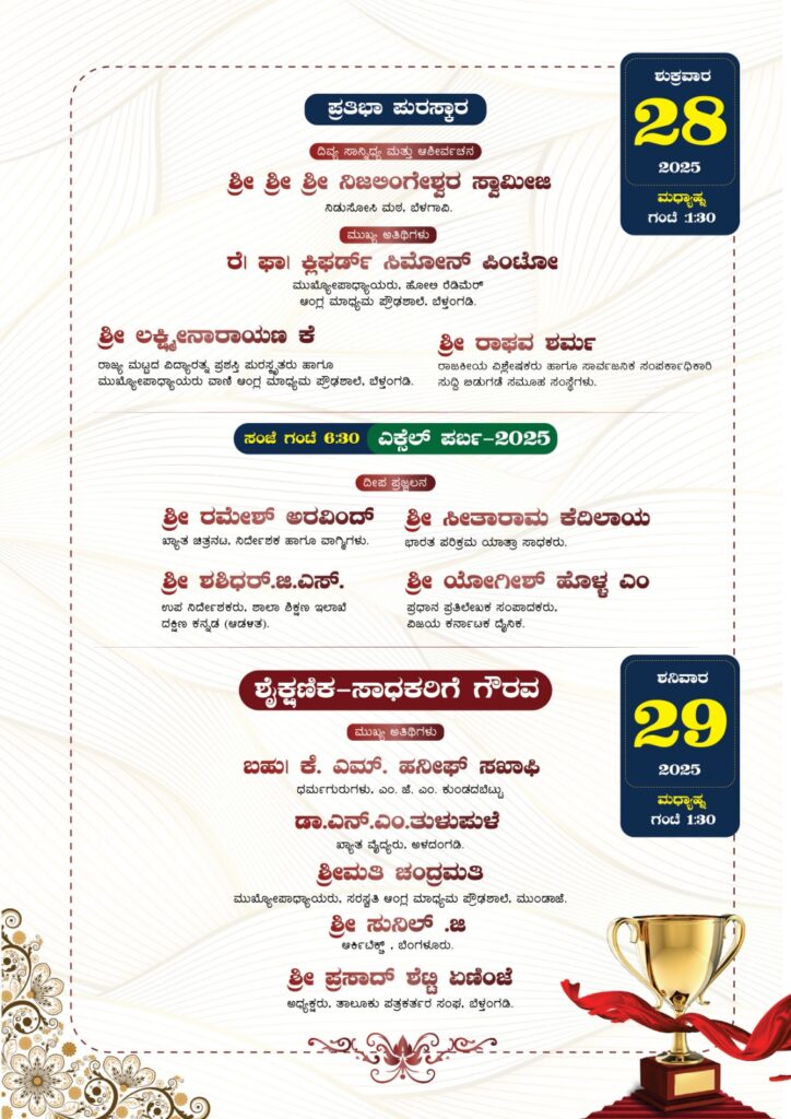 ನ.28ರಂದು ಮಧ್ಯಾಹ್ನ 1.30ಕ್ಕೆ ಜರಗಲಿರುವ ಪ್ರತಿಭಾ ಪುರಸ್ಕಾರ ಸಮಾರಂಭದಲ್ಲಿ ಬೆಳಗಾವಿ ನಿಡುಸೋಸಿ ಮಠದ ಶ್ರೀ ನಿಜಲಿಂಗೇಶ್ವರ ಸ್ವಾಮೀಜಿ ಆಶೀರ್ವಚನ ನೀಡಲಿದ್ದಾರೆ. ಸಂಜೆ 6.30ಕ್ಕೆ ನಡೆಯುವ ಎಕ್ಸೆಲ್ ಪರ್ಬ ಸಮಾರಂಭವನ್ನು ನಟ ರಮೇಶ್ ಅರವಿಂದ್ ಉದ್ಘಾಟಿಸಲಿದ್ದು, ಭಾರತ ಪರಿಕ್ರಮ ಯಾತ್ರಾ ಸಾಧಕ ಸೀತಾರಾಮ ಕೆದಿಲಾಯ, ಡಿಡಿಪಿಐ ಶಶಿಧರ್ ಜಿ.ಎಸ್, ಪತ್ರಕರ್ತ ಯೋಗೀಶ್ ಹೊಳ್ಳ ಎಂ. ಭಾಗವಹಿಸಲಿದ್ದಾರೆ.