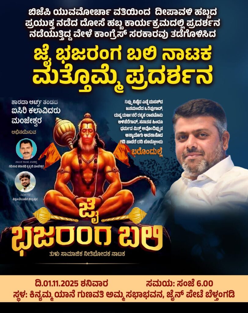 ಬೆಳ್ತಂಗಡಿ :(ಅ.29) ಬೆಳ್ತಂಗಡಿ ಬಿಜೆಪಿ ಯುವಮೋರ್ಚಾ ವತಿಯಿಂದ ದೀಪಾವಳಿ ಹಬ್ಬದ ಪ್ರಯುಕ್ತ ನಡೆದ 6ನೇ ವರ್ಷದ ದೋಸೆಹಬ್ಬ ಕಾರ್ಯಕ್ರಮದಲ್ಲಿ ಪ್ರದರ್ಶನ ನಡೆಯುತ್ತಿದ್ದ ವೇಳೆ ಕಾಂಗ್ರೆಸ್ ಸರ್ಕಾರವು ತಡೆಗೊಳಿಸಿದ ತುಳು ಸಾಮಾಜಿಕ ನೀತಿಬೋಧಕ ನಾಟಕ ಜೈ ಭಜರಂಗ ಬಲಿ ನಾಟಕ ಮತ್ತೊಮ್ಮೆ ಪ್ರದರ್ಶನಗೊಳ್ಳಲಿದೆ.