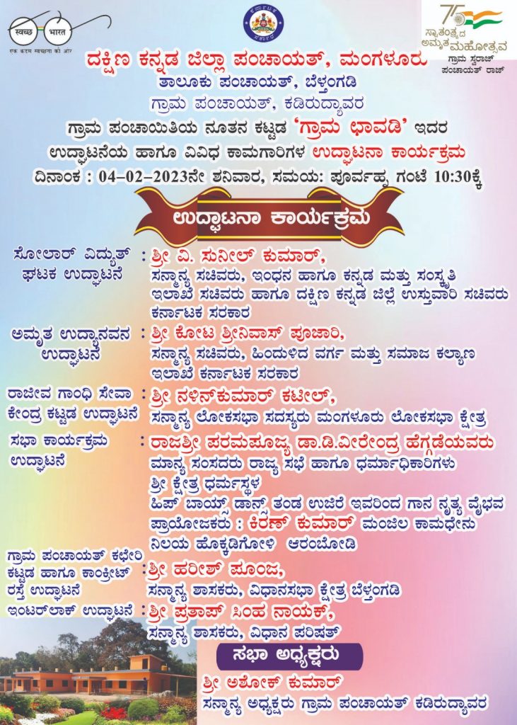 ಫೆ.4ರಂದು ಪಂಚಾಯತ್ ಕಟ್ಟಡ ಉದ್ಘಾಟನೆಗೊಳ್ಳಲಿದೆ. ಈ ಉದ್ಘಾಟನಾ ಸಮಾರಂಭದಲ್ಲಿ ಧರ್ಮಸ್ಥಳದ ಧರ್ಮಾಧಿಕಾರಿ ಡಾ.ಡಿ.ವೀರೇಂದ್ರಹೆಗ್ಗಡೆಯವರು (ರಾಜ್ಯಸಭಾ ಸದಸ್ಯರು) ಜಿಲ್ಲಾ ಉಸ್ತುವಾರಿ ಸಚಿವ ವಿ.ಸುನೀಲ್ ಕುಮಾರ್, ಉಡುಪಿ ಜಿಲ್ಲಾ ಸಚಿವರಾದ ಕೋಟ ಶ್ರೀನಿವಾಸ ಪೂಜಾರಿ, ಶಾಸಕ ಹರೀಶ್ ಪೂಂಜ, ವಿಧಾನ ಪರಿಷತ್ ಶಾಸಕರಾದ ಕೆ.ಪ್ರತಾಪಸಿಂಹ ನಾಯಕ್, ಹರೀಶ್ ಕುಮಾರ್, ಮಂಜುನಾಥ ಭಂಡಾರಿ, ಹರಿಕೃಷ್ಣ ಬಂಟ್ವಾಳ, ಜಿ.ಪಂ.ಮುಖ್ಯ ಕಾರ್ಯನಿರ್ವಹಣಾಧಿಕಾರಿ ಕುಮಾರ್, ಜಿಲ್ಲಾ ಉಪಕಾರ್ಯದರ್ಶಿ ಕೆ.ಆನಂದ ಕುಮಾರ್, ಕಾರ್ಯನಿರ್ವಹಣಾಧಿಕಾರಿ ಕುಸುಮಾಧರ್, ತಾಲೂಕಿನ ತಹಶೀಲ್ದಾರ್ ಹಾಗೂ ಕಾರ್ಯಪಾಲಕ ಅಭಿಯಂತರರು ನಿತಿನ್ ಕುಮಾರ್ ನಾಯಕ್ ಮೊದಲಾದ ಗಣ್ಯರು ಭಾಗವಹಿಸಲಿದ್ದಾರೆ.
