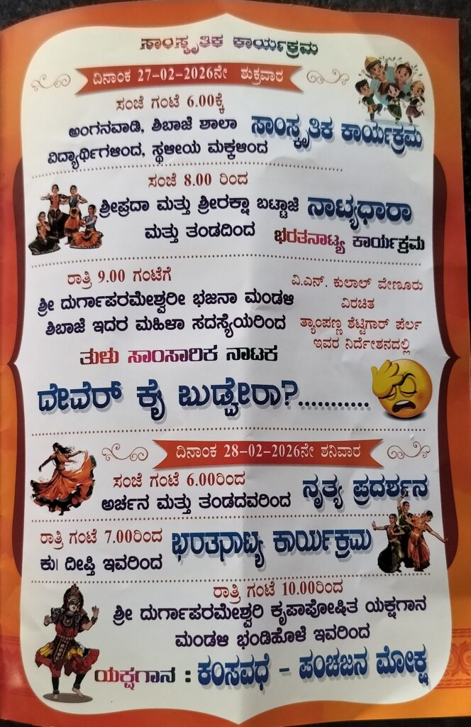 ದಿನಾಂಕ 28-02-2026ನೇ ಶನಿವಾರದಂದು ಬೆಳಿಗ್ಗೆ: ಕಲಶ ಪೂಜೆ,