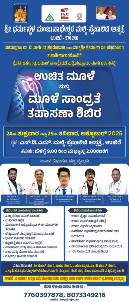 ನಾಳೆ ಎಸ್.ಡಿ.ಎಂ ಮಲ್ಟಿ ಸ್ಪೆಷಾಲಿಟಿ ಆಸ್ಪತ್ರೆ ಉಜಿರೆಯಲ್ಲಿ ಉಚಿತ ಮೂಳೆ ಮತ್ತು ಮೂಳೆ ಸಾಂದ್ರತೆ ತಪಾಸಣಾ ಶಿಬಿರ